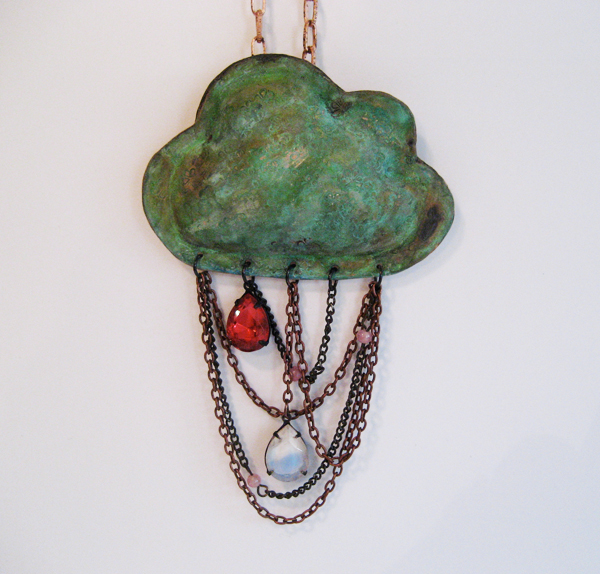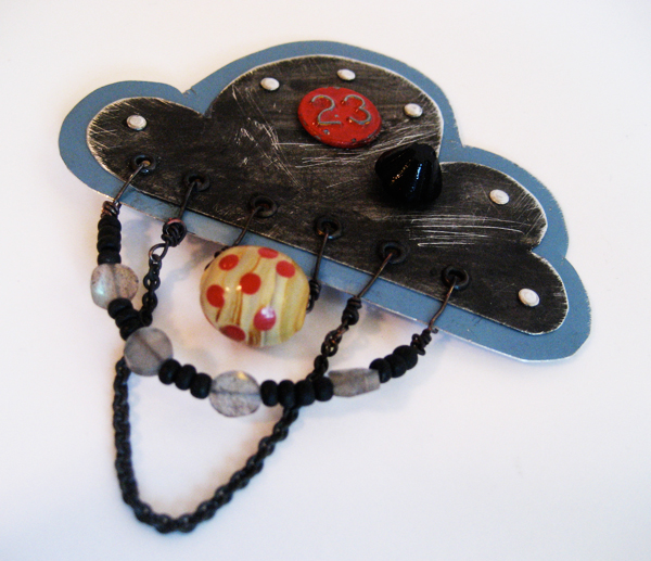 Made this yesterday with tin printing plates scored during a press check. This is my favorite tin piece thusfar and will be a series, no doubt. I’ve been working with this shape in metal class too, puffing the clouds on the hydraulic. Pics to come! The polka dot bead was etched and is suspended on […]
